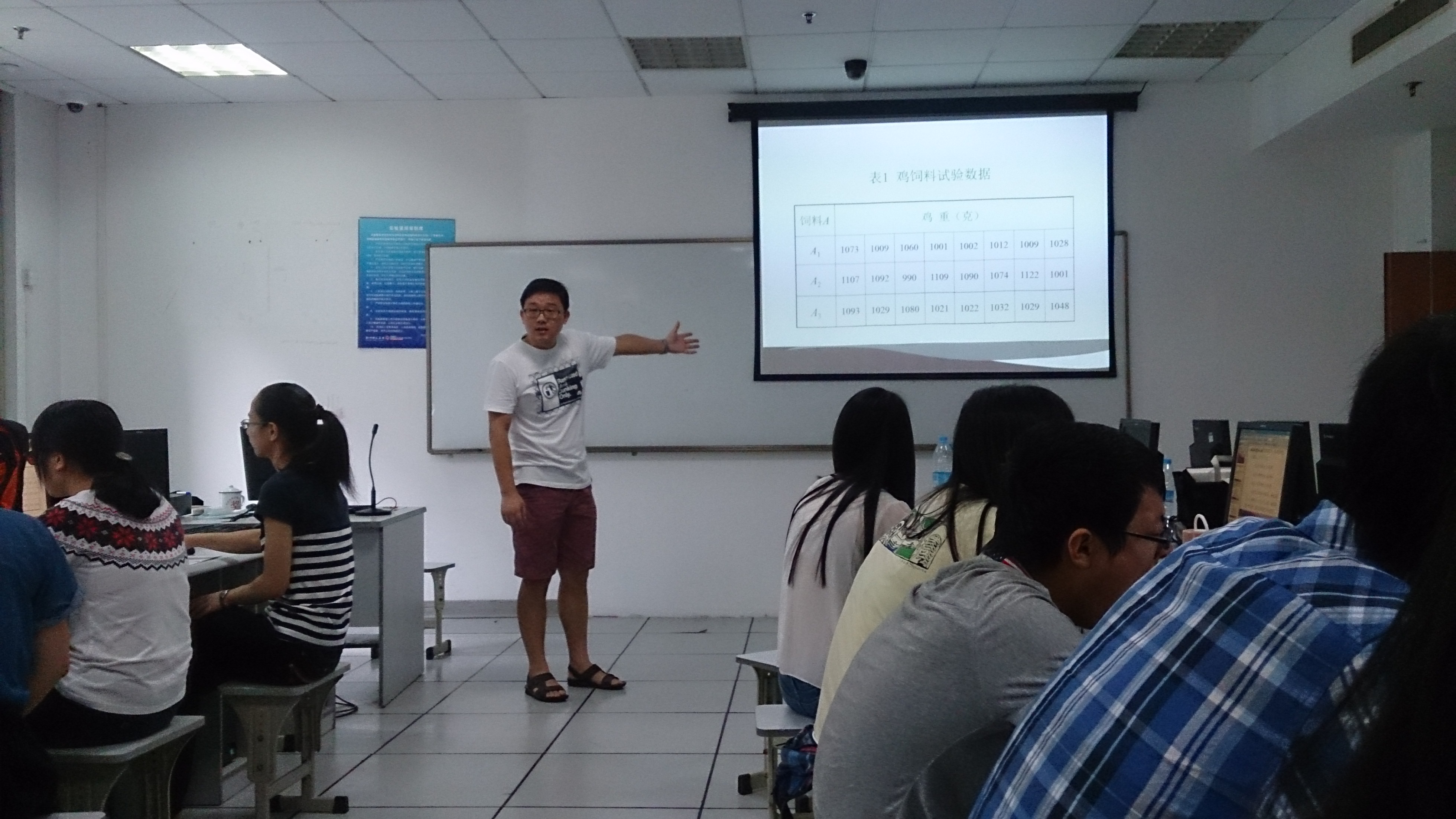 今天是吕平老师的课,当他拿着画有革命精神“奖”字的铁杯进教室的时候同学们眼前一亮,之后的上课时间的的确确很好地诠释了老师的幽默,也让同学们在乐趣中获取了知识。课堂上,吕老师给同学们解释了何为方差分析,针对变量的维数一一进行了讲解和拓展,由浅到深,循序渐进。再辅以PDF文档,理论结合实践,让同学们通过Matlab自主探索。在敲下键盘的瞬间,同学们看到了形似倒立腰鼓的一幅幅图,配以数字的说明使研究的问题一目了然。实践过程中,吕平老师缓缓踱步于机房的过道中,及时耐心地解答同学们的问题,并且会根据同学们的问题进行总结,再整体为全体同学讲解,令人印象深刻。下午,吕老师留给了同学们充足的时间去自主实践,偶尔会看到同学们紧锁的眉头似在深思,当然也能看到同学们成功解决问题时的微微一笑。认真的人魅力无限而不自知,能投入地研究接近生活的数学问题,思考并解决是帅气的。在同学们身上可以看到蓬勃的朝气和不畏艰难的勇气。