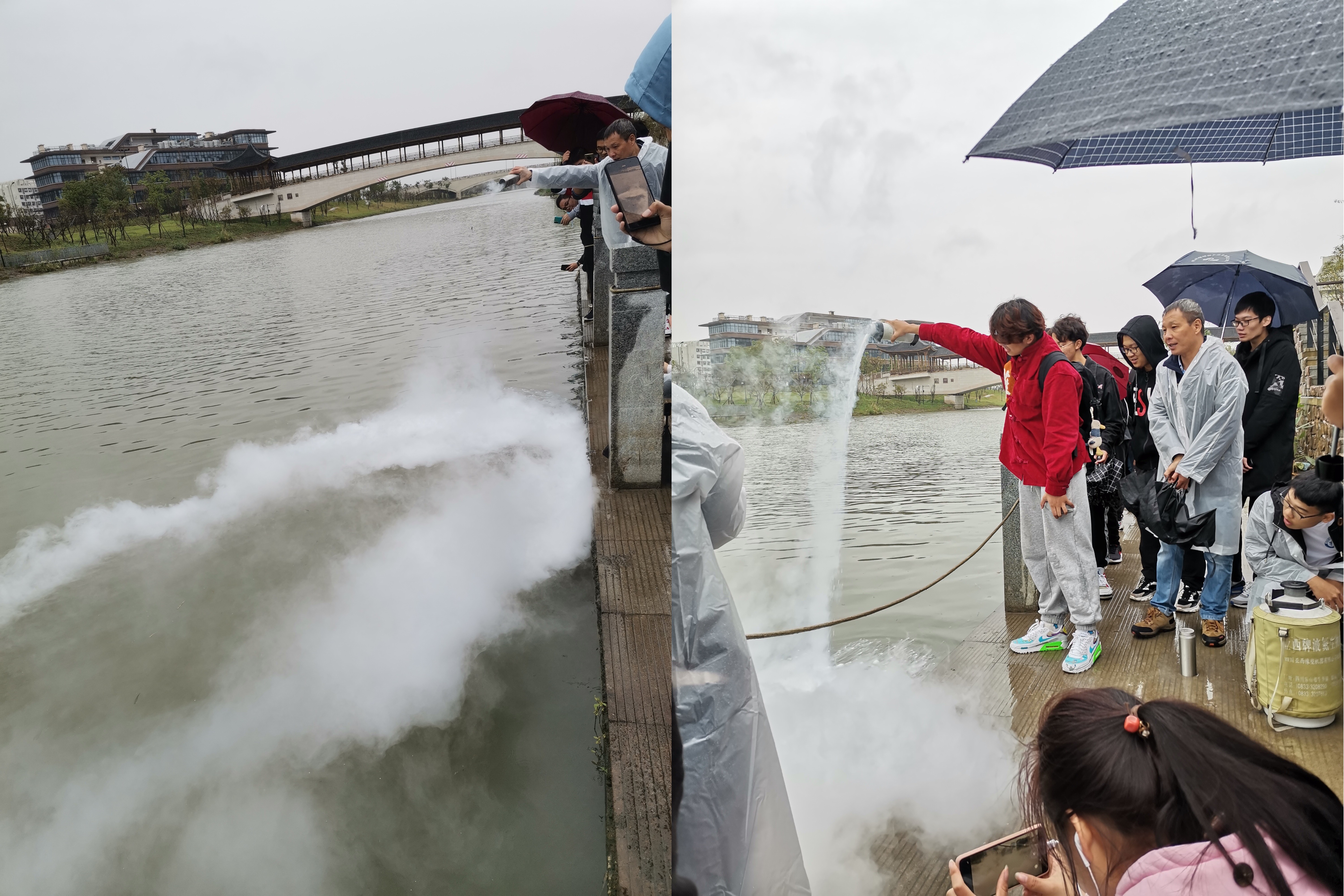 第二项活动“雾里看花”移师余杭塘河边的小码头进行。只见陈斌老师将保温杯中的液氮倒向河面,液氮汽化吸收了大量的热量,使得周围环境迅速降温,空气中的水蒸气随之液化,形成了美丽的白雾,沿着河面升腾而起。大家都仿佛置身于仙境之中,发出阵阵惊叹。看,这位围观的同学也在好奇心的驱使下亲自上阵体验了一番“造雾”的神奇。