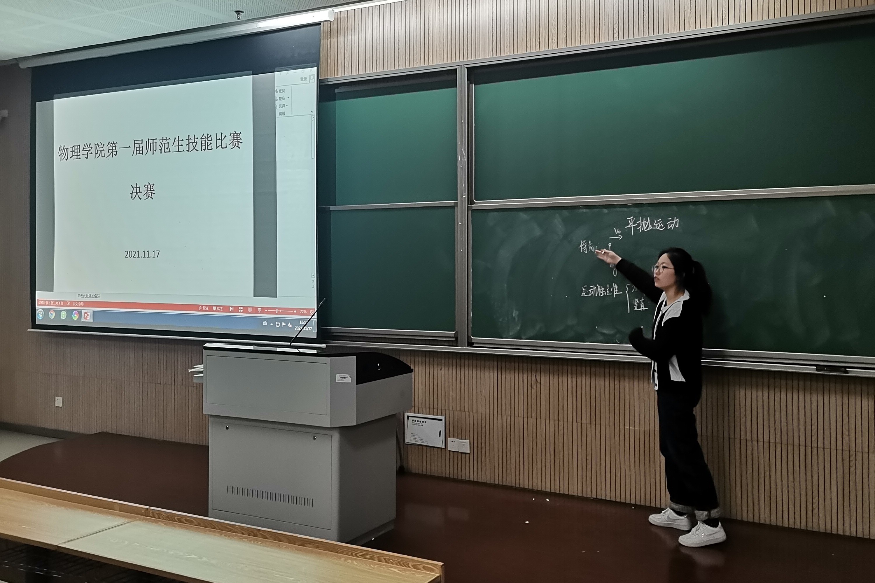 11月17日下午,仓前校区勤园6-104教室里传来娓娓动听的讲课声,这里正在进行的是由物理学院教工第一党支部、浙江省高校“双带头人”教师党支部书记工作室、共青团杭州师范大学物理学院委员会共同举办的物理学院第一届师范生技能比赛决赛。