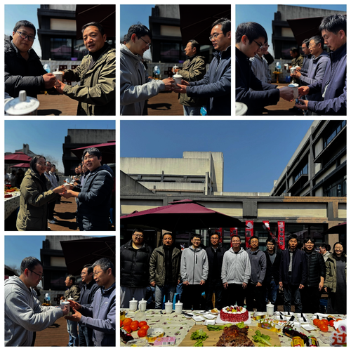 活动现场,鎏金装饰与物理元素交相辉映:"生日快乐"条幅流苏轻扬,恰似优美的波动方程曲线;甜品台上,精心设计的蛋糕以光谱色系层叠晕染,吸引众多目光。寿星教师们沐浴着春日暖阳,在教职工们的注视中定格携手并肩的幸福瞬间。寿星代表还携手切下生日蛋糕,将这份甜蜜与祝福传递给在场的每一位同仁。