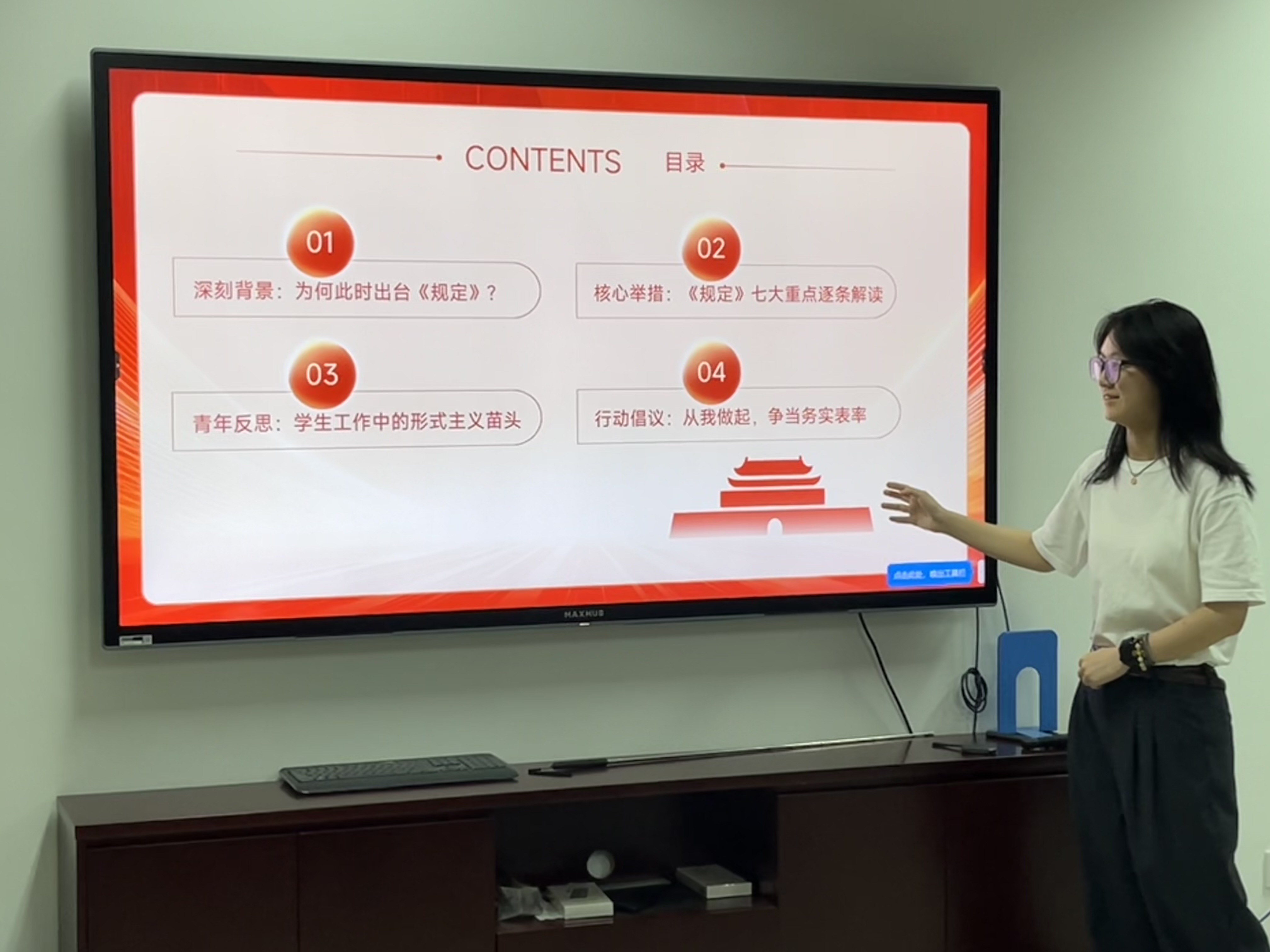 其次由周逸歌聚焦《关于持续解决形式主义突出问题为基层减负的赋能规定》开展学习研讨。周逸歌介绍,当前基层存在文山会海、过度留痕等问题,分散干部精力、影响政策落实,该规定的出台旨在建立基层减负长效机制,引导干部树立正确政绩观,体现党中央对基层工作的关心支持。号召全体师生党员争当务实表率:强化思想认识,树立“重实干、重实绩”观念;勇于批评监督,对形式主义苗头说“不”;坚持实事求是,不搞花架子与表面文章;聚焦主责主业,投入专业学习与为民服务,发挥党员先锋模范作用。