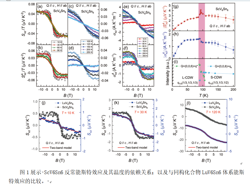 本研究首次发现了非磁性kagome材料ScV6Sn6中的各向异性的反常输运性质,包括反常霍尔效应和反常能斯特效应,以及巨大的各向异性磁电阻和线性磁热电势等等,这些性质主要依赖于其电荷密度波序态呈现的隐藏磁性或者轨道电流和手性电荷等导致的时间反演对称性破缺现象;进一步的证据需要更多的实验支持。