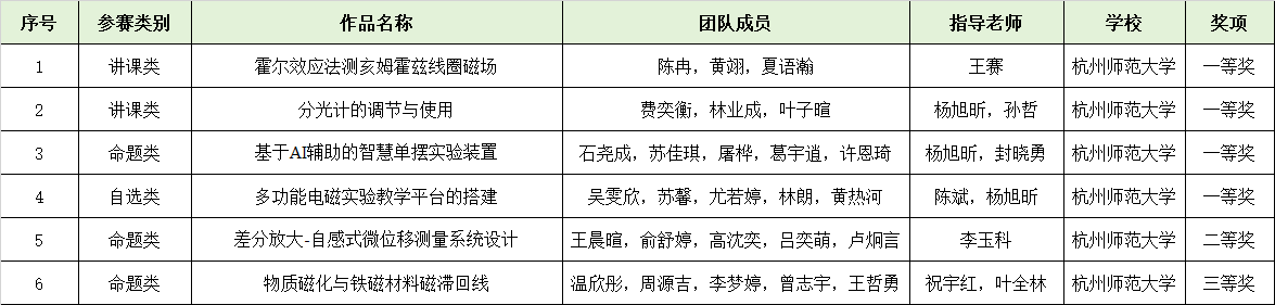 近日,第十一届全国大学生物理实验竞赛(创新)决赛在中南大学举行。来自全国331所高校的750支优秀代表队从3260支预赛队伍中脱颖而出,2000余名师生齐聚长沙,用智慧与实干演绎物理实验的创新魅力。我院组织并指导6支队伍参赛,获一等奖4项、二等奖1项、三等奖1项,杭州师范大学代表队获优秀组织奖。