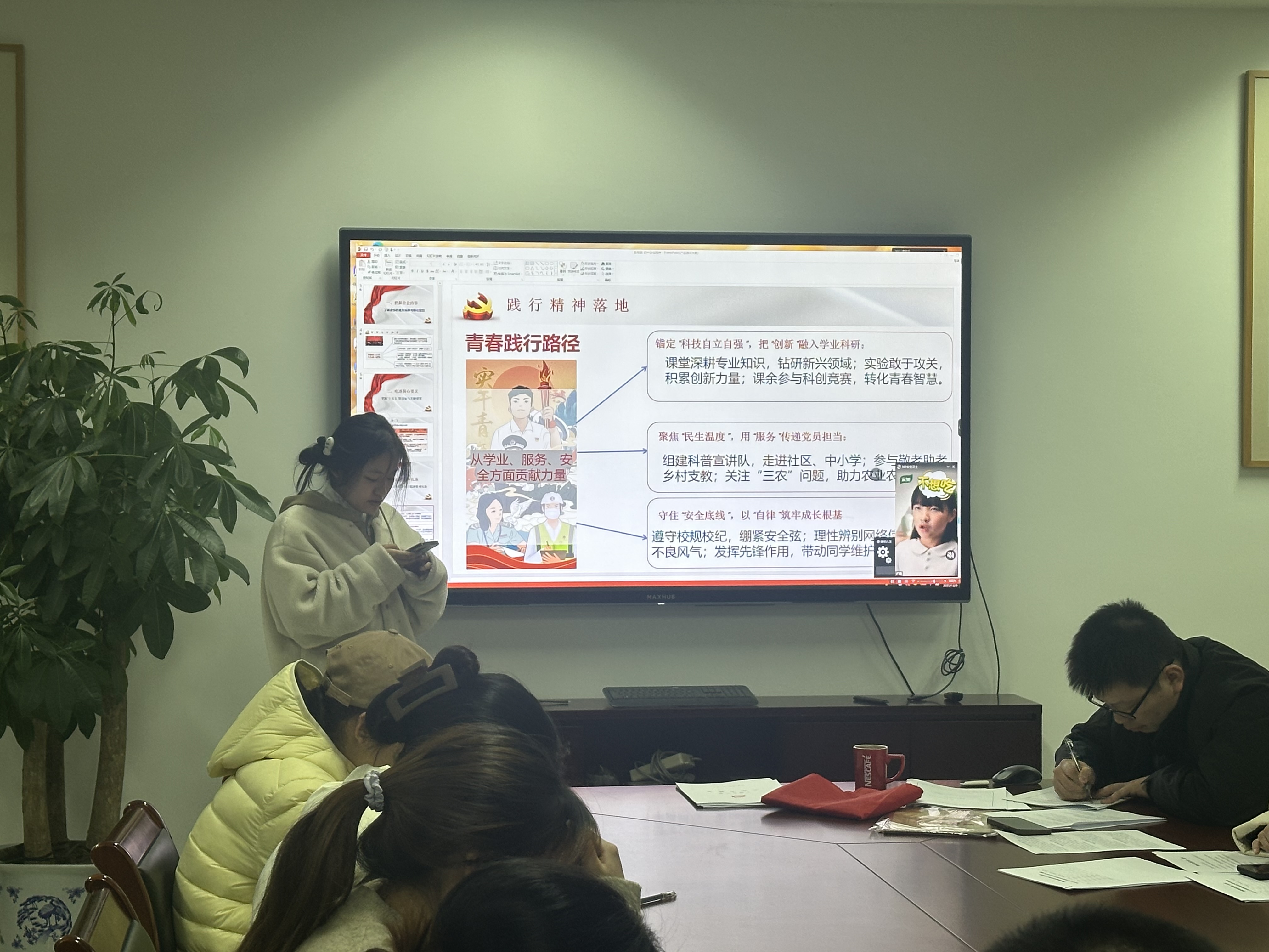 第三项议程是党日活动,陈黎颖和马艺飒两位同学以“学习贯彻党的二十届四中全会精神”为主题,分享他们学习党的二十届四中全会精神的心得体会,全会吹响了“十五五”时期奋进的号角,我们要积极响应全会号召,牢记“六个坚持”重要原则,凝心聚力、奋发进取。以推动高质量发展为主题,以满足人民日益增长的美好生活需要为根本目的,向着高质量发展取得显著成效、科技自立自强水平大幅提高等“十五五”主要目标勇毅前行,为确保基本实现社会主义现代化取得决定性进展,为全面建成社会主义现代化强国、实现第二个百年奋斗目标,以中国式现代化全面推进中华民族伟大复兴而努力奋斗!