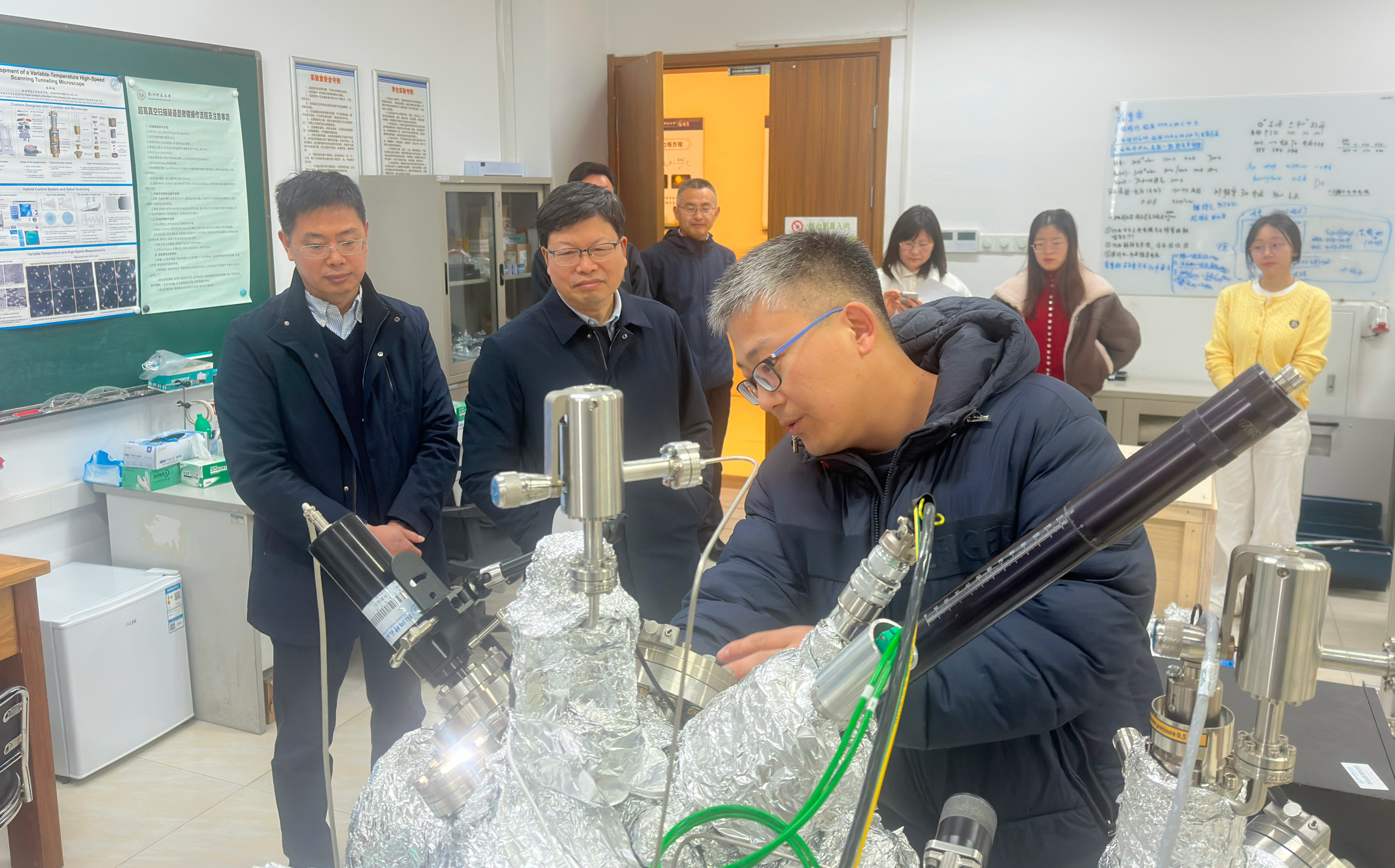 应飚副书记首站来到了超高真空变温扫描隧道显微镜实验室。他饶有兴致地参观了实验室,并与实验室负责人杨泽超教授、团队成员以及在读研究生们展开深入交流。在听取了杨教授关于科研仪器设备自主设计搭建、科研项目推进等实验室建设工作汇报之后,应书记对实验室取得的成绩给予充分肯定,并勉励实验室师生要紧密围绕国家战略需求,充分结合杭州区域发展定位,在专业领域深耕细作、勇于挑战难题;要持续提升科研创新能力,将科研成果高效转化为实际生产力,努力产出更多具有国际影响力的高水平科研成果,切实将科研优势转化为服务地方社会经济发展和推动国家战略实施的实际成效。