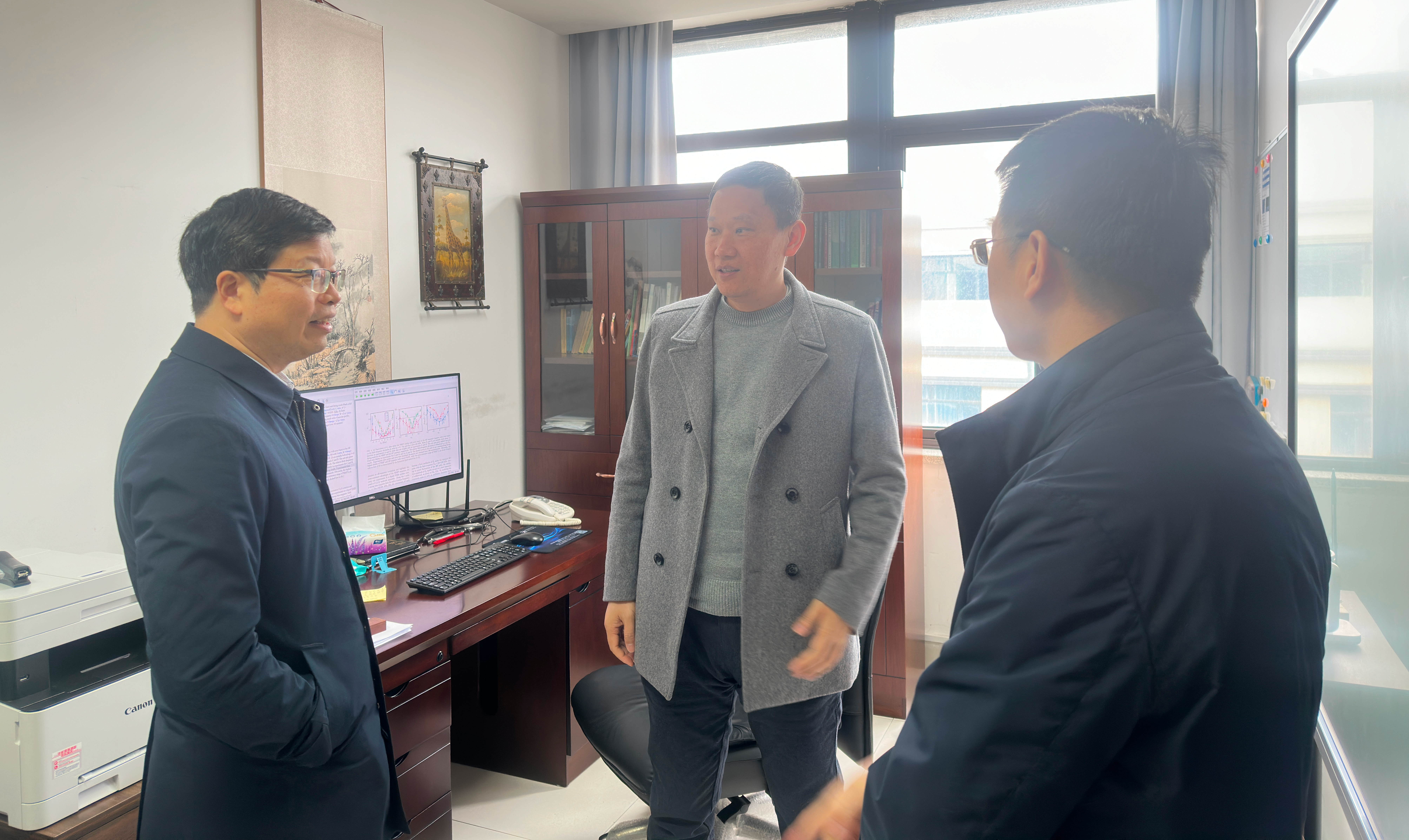随后,应飚副书记依次走访了学院人才之家和理论物理中心,仔细了解了场所的运行情况。之后,他又来到教师办公室,亲切慰问了国家级人才张文献教授和省级人才钟建强教授,向他们送上新学期的美好问候,并关切地询问他们的科研工作进展,鼓励他们在新学期取得更优异的成绩。