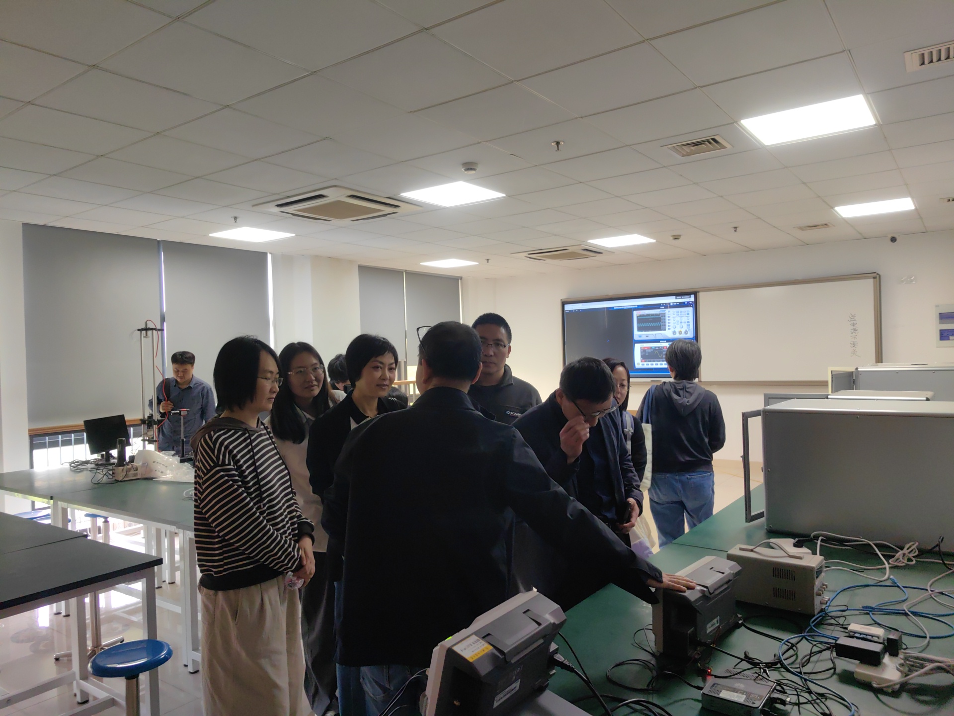 4月8日下午,物理学院组织13名教师前往浙江工业大学物理国家级实验教学示范中心考察交流。浙工大实验中心主任刘凡新教授、陈钢教授热情接待了学院教师一行,并陪同参观了基础物理实验室和AI实验室。